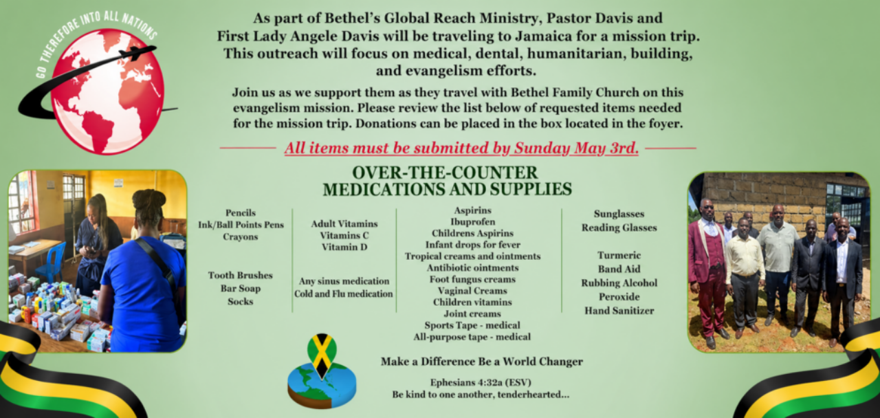 The ministry’s mission and goal is to reach the lost for Christ, grow in the knowledge of God’s word and serve others by being to them, what Christ has been to us!